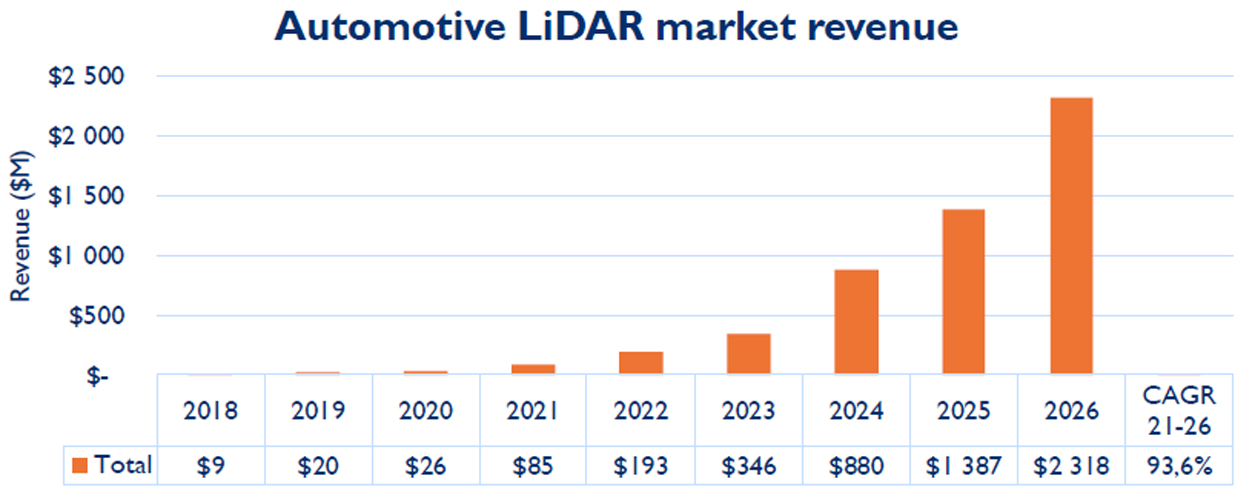 車載激光雷達(dá)市場(chǎng)規(guī)模預(yù)測(cè) 來源:YOLE